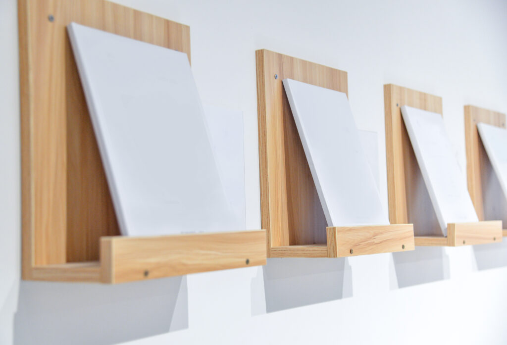 Parapety, blaty, półki z drewna.